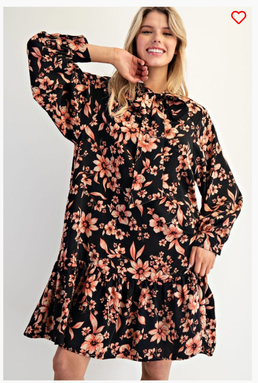 Easel Mock Tie Printed Ruffle Bottom Dress
