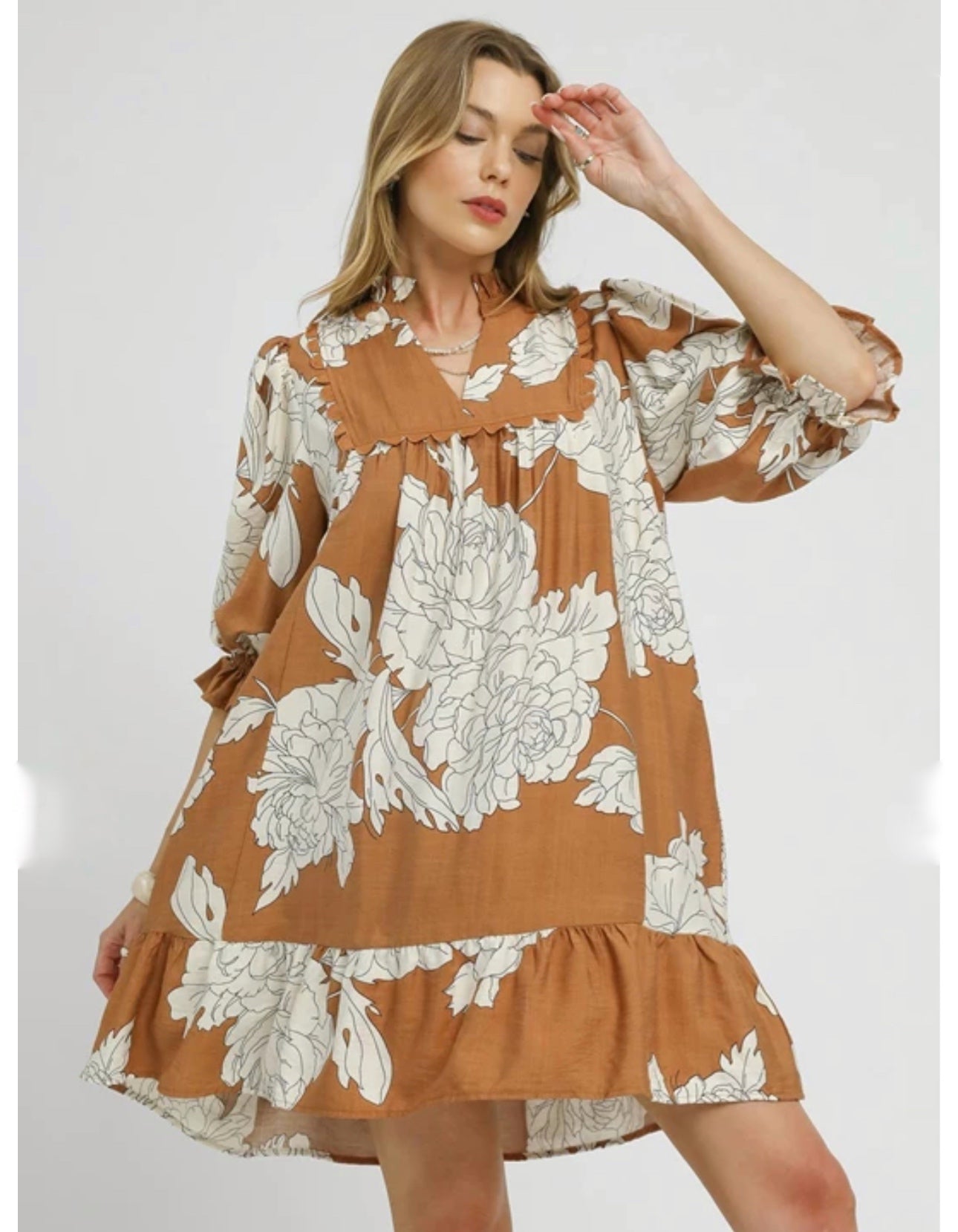 Umgee Printed Smock Dress in Camel